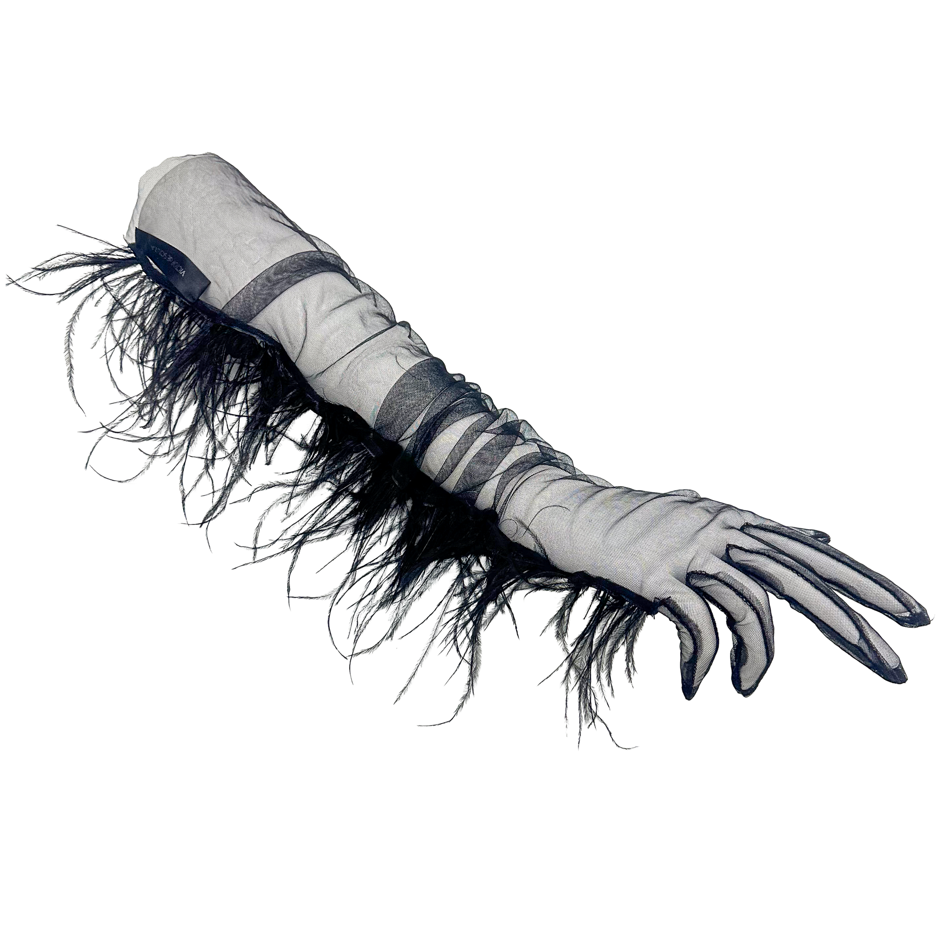 Elevate your evening wear with this luxurious sheer opera glove, featuring delicate ostrich feather detailing that cascades gracefully down the side hem. The sheer construction offers refined elegance while the feather embellishment adds dramatic movement and texture. Perfect for formal occasions, galas, and editorial styling, this piece combines timeless sophistication with contemporary flair. A statement accessory that transforms any ensemble into haute couture.